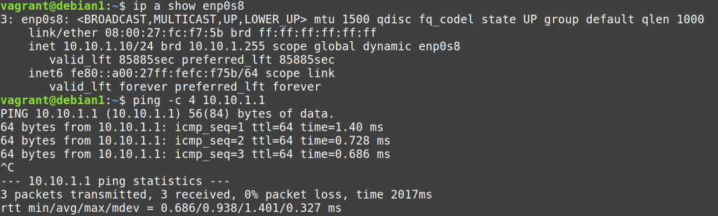 vagrant ssh debian1 -c “ip link show enp0s8 | grep ether”